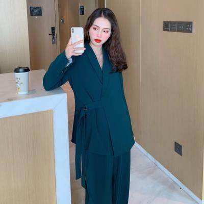 冬季套装女韩版设计感系带中长款西装外套+高腰拖地阔腿裤两件套热门设计联盟服务商