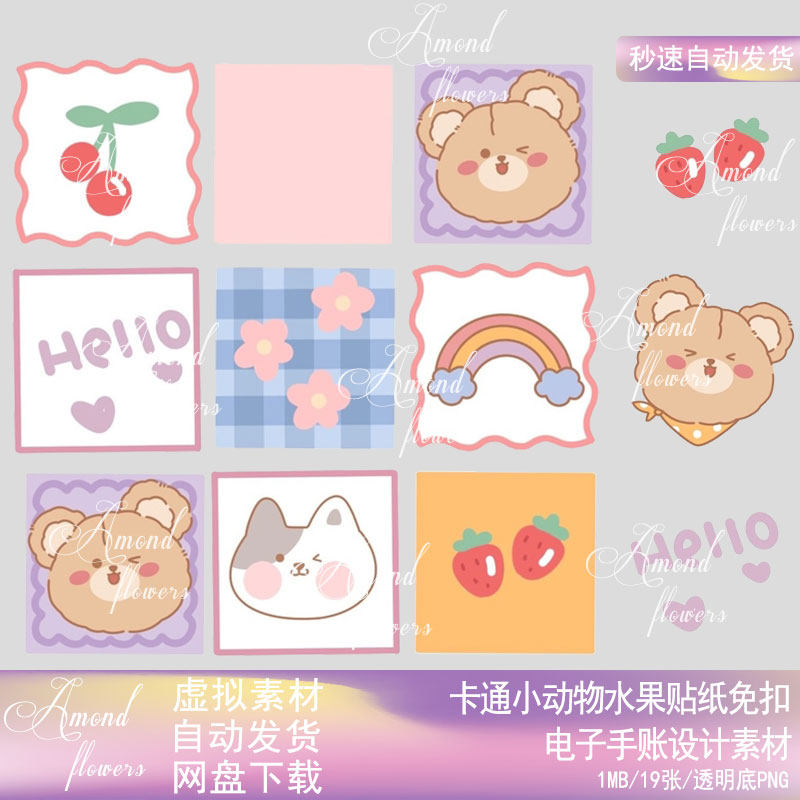 2gf卡通小动物熊小猫水果草莓樱桃贴纸电子手账png免抠图psd素材热门设计联盟服务商